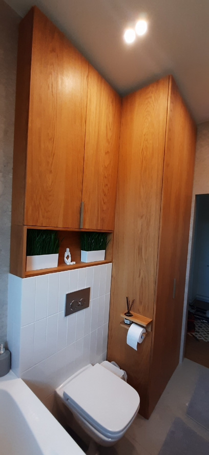 Наша фабрика производит под заказ шкафы над инсталляцией, которые позволяют скрыть монтажные системы и любое оборудование в ванной. Одновременно в этих шкафах можно организовать секции, полки, удобные места хранения.