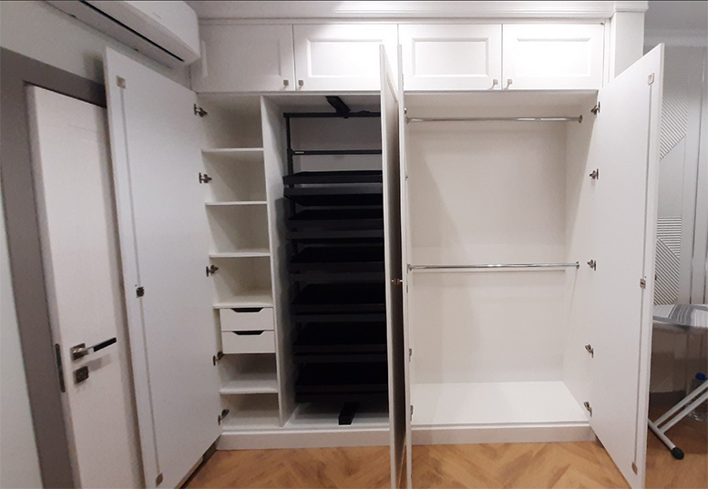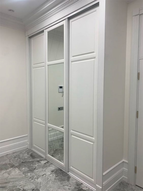 За классическими фасадами скрываются удобные системы раздвижения дверей – плавные, бесшумные, внутри организованы места для аккуратного хранения одежды и других вещей, подсветка.